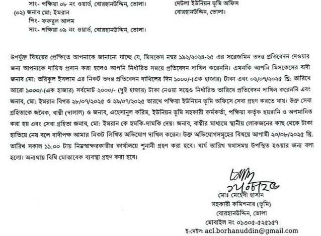 বোরহানউদ্দিনে ইউনিয়ন ভূমি উপ-সহকারী কর্মকর্তা এহেসানুল করিম এর বিরুদ্ধে ঘুষ বাণিজ্যের অভিযোগ