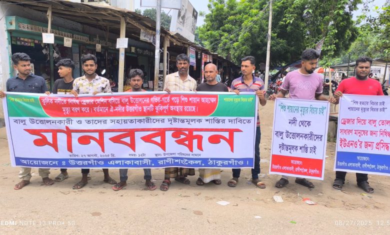ঠাকুরগাঁওয়ের রাণীশংকৈল কুলিক নদীতে ড্রেজার দিয়ে বালু উত্তোলনের গর্তে পড়ে শিশু নিহতের ঘটনায় বুধবার দুপুরে উপজেলা পরিষদের সামনে মানববন্ধন অনুষ্ঠিন হয়।