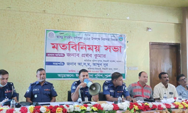 পাবনার ঈশ্বরদীতে আসন্ন শারদীয় দুর্গাপূজা উপলক্ষে নিরাপত্তা বিষয়ক মতবিনিয় সভা অনুষ্ঠিত হয়েছে।