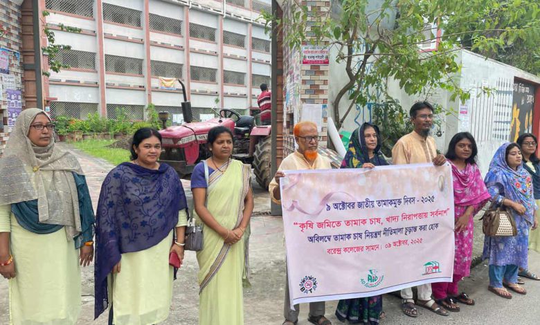 “কৃষি জমিতে তামাক চাষ, খাদ্য নিরাপত্তায় সর্বনাশ” — এই প্রতিপাদ্যকে সামনে রেখে জাতীয় তামাকমুক্ত দিবস-২০২৫ উপলক্ষে মানববন্ধন অনুষ্ঠিত হয়েছে।