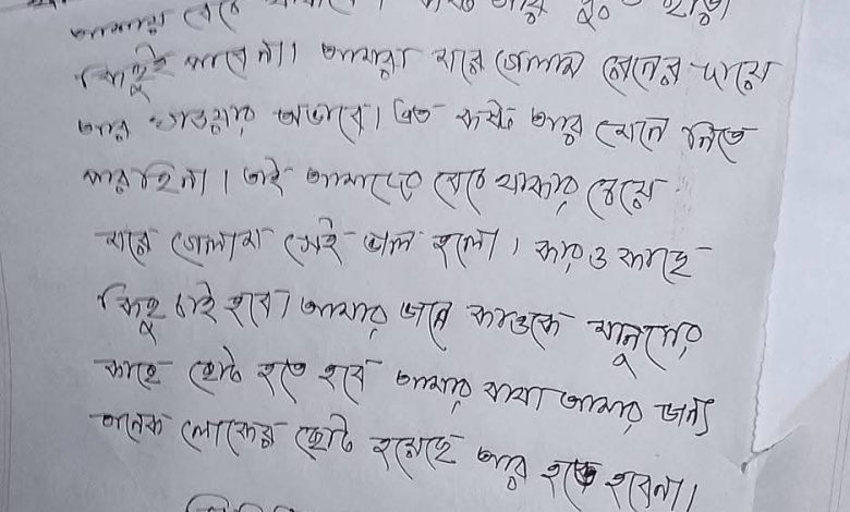 এতে আরও লেখা হয়েছে, ‘আমার জন্যে কাওকে মানুষের কাছে ছোট হতে হবে না। আমার বাবা আমার জন্য মানুষের কাছে অনেক লোকের কাছে ছোট হয়েছে, আর হতে হবে না। চির দিনের জন্য চলে গেলাম। আমি চাই সবাই ভাল থাকবেন।