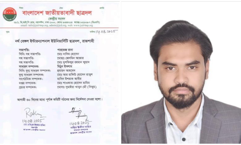 গত ১৪ তারিখ বাংলাদেশ জাতীয়বাদী ছাত্রদলের কেন্দ্রীয় সংসদের সভাপতি রাকিবুল ইসলাম রাকিব ও কেন্দ্রীয় সংসদের সাধারণ সম্পাদক নাছির উদ্দীন নাসিরের স্বাক্ষরিত বিজ্ঞপ্তিতে রাজশাহীর নর্থ বেঙ্গল ইন্টারন্যাশনাল ইউনিভার্সিটি ছাত্রদলের পারভেজ রানা সভাপতি ও সাধারণ সম্পাদক মিঠুন ইসলাম কে উল্লেখ করে ১০ জন বিশিষ্ট আগামী ৩০ দিনের মধ্যে পূর্ণাঙ্গ কমিটি কমিটি গঠনের জন্য নির্দেশনা প্রদান করা হয়।